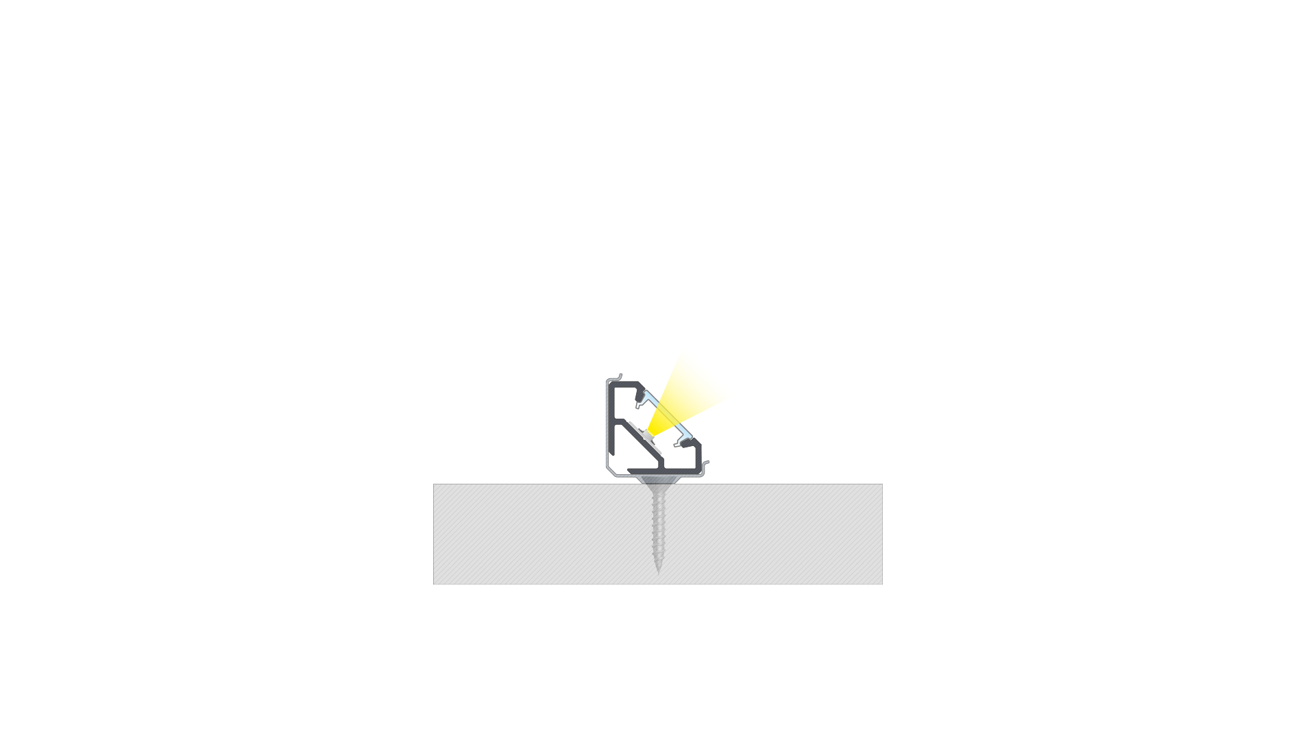 Aufputz- oder abgehängtes LED-Profil, das in einem Winkel von 45° strahlt. Ideal für gerichtete Anwendungen in der dekorativen Beleuchtung und Akzent.