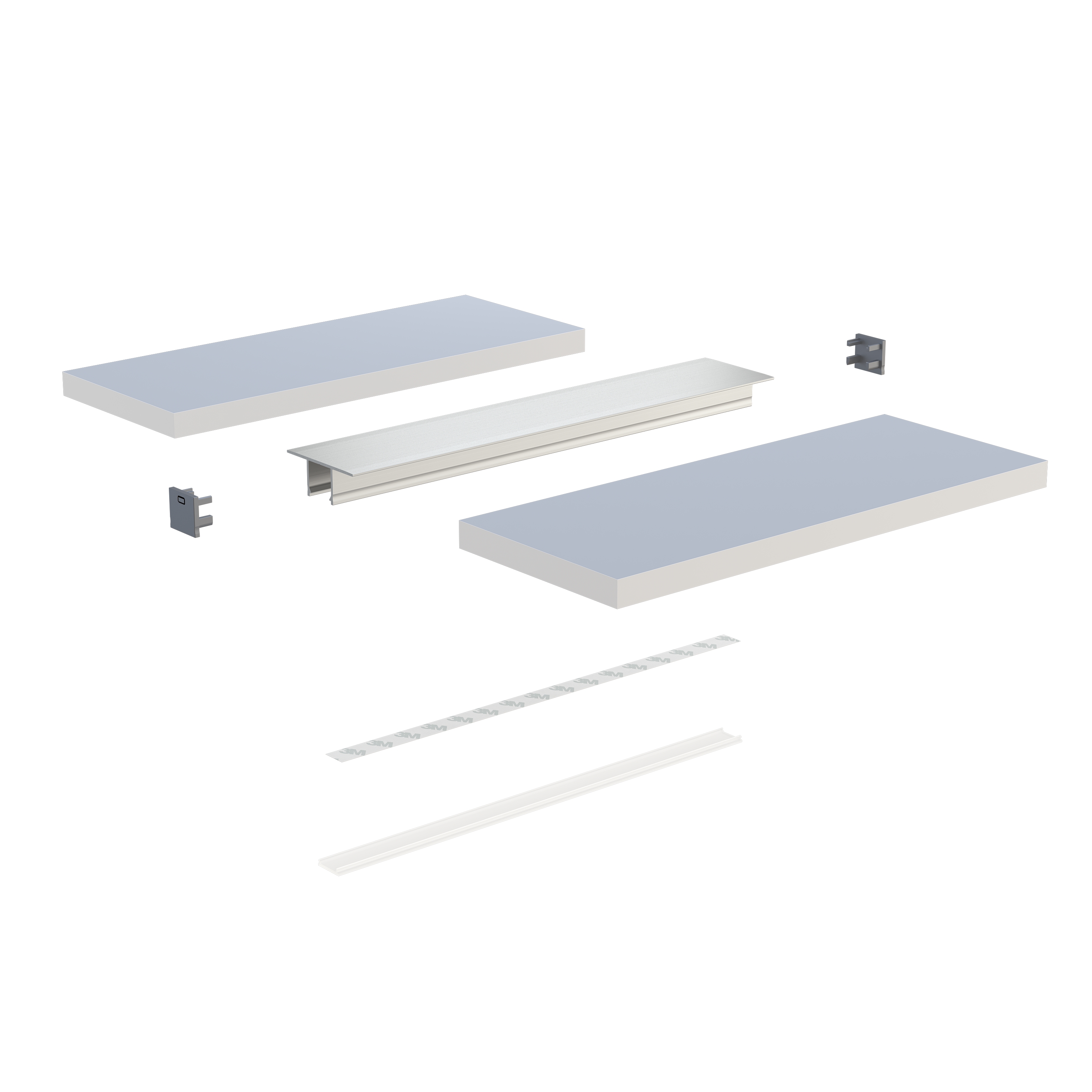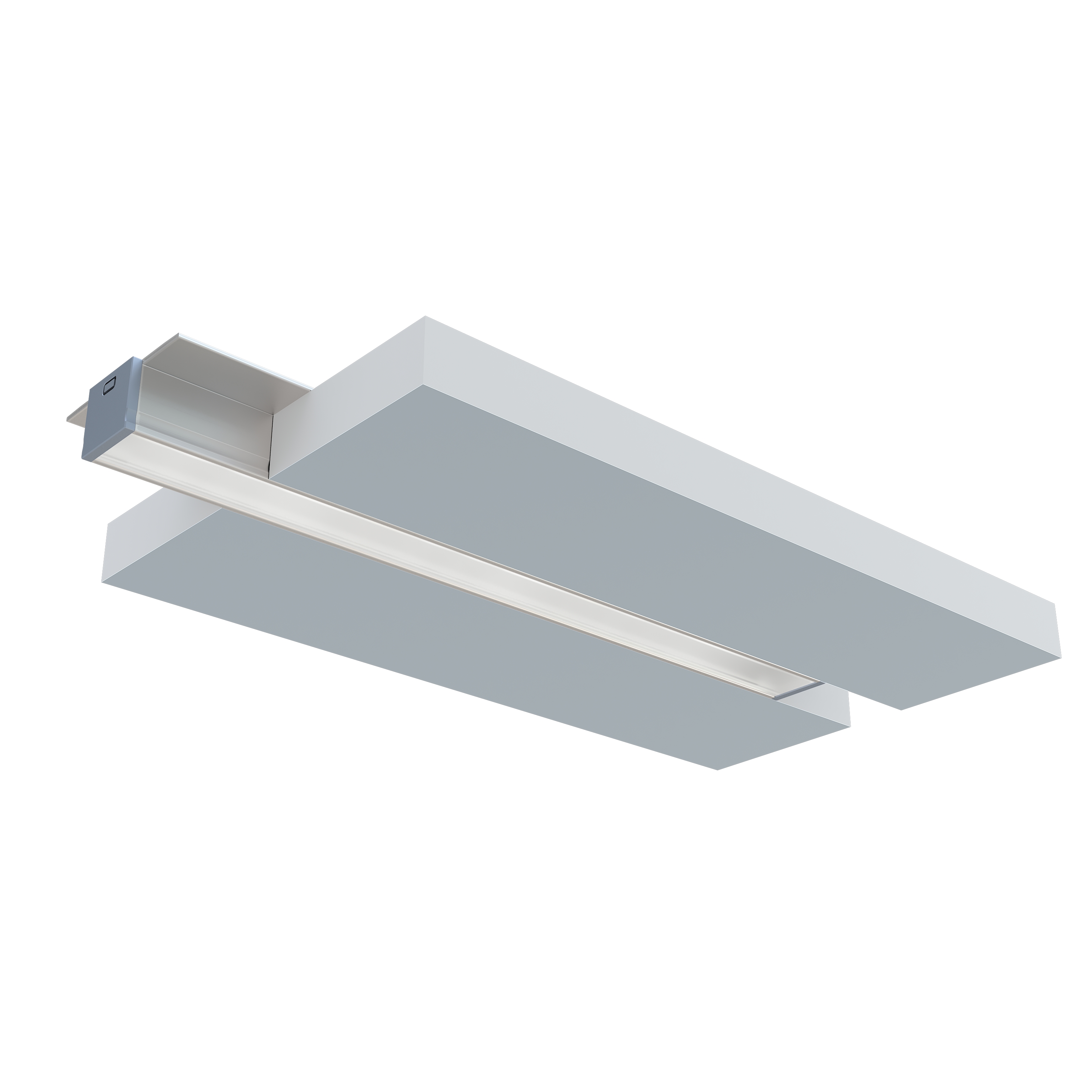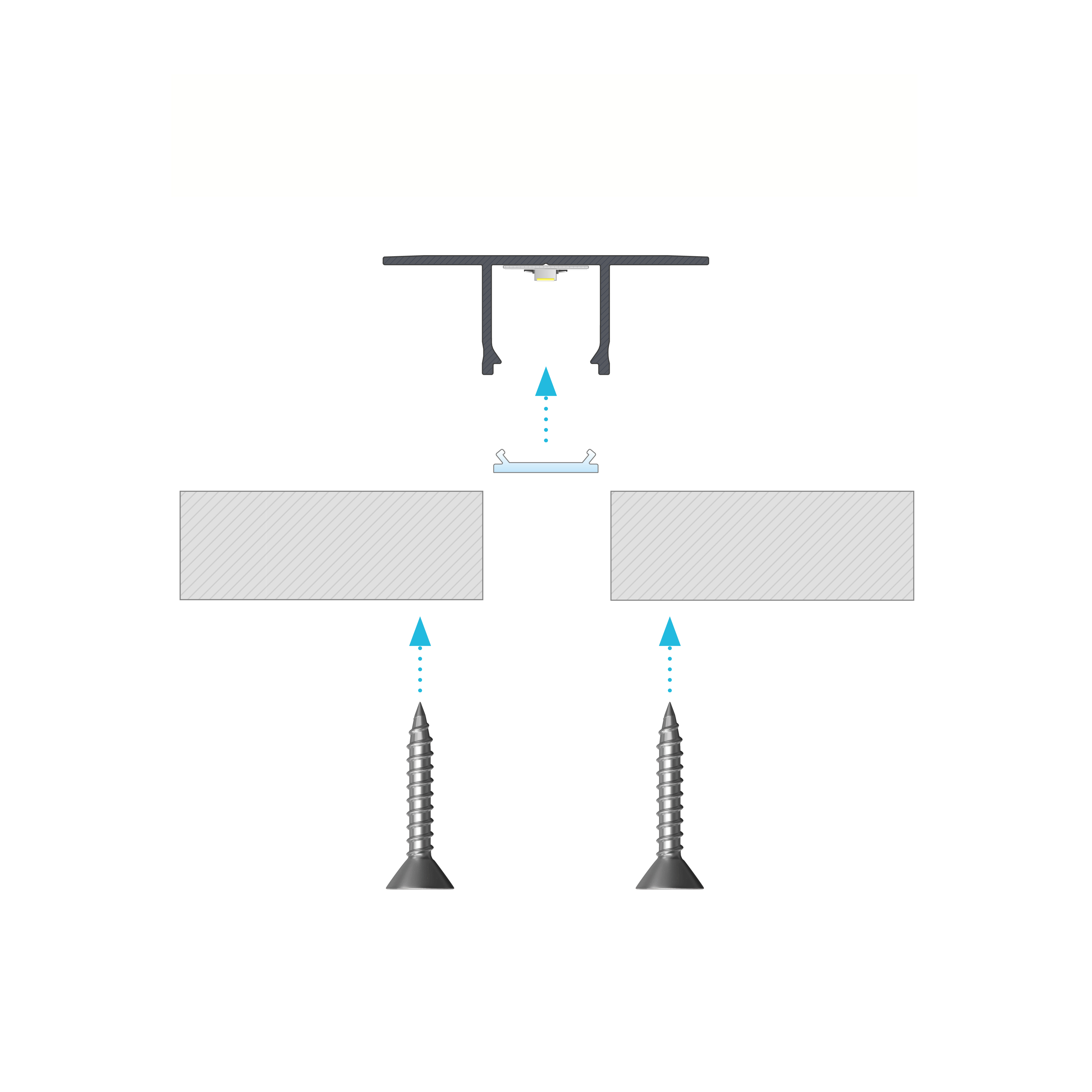 Ein einzelnes LED-Profil zur Installation zwischen zwei Gipskartonplatten. Es ermöglicht eine schnelle Montage mit Schrauben und die Endbearbeitung mit Spachtelmasse, ohne dass ein Montagenetz erforderlich ist.