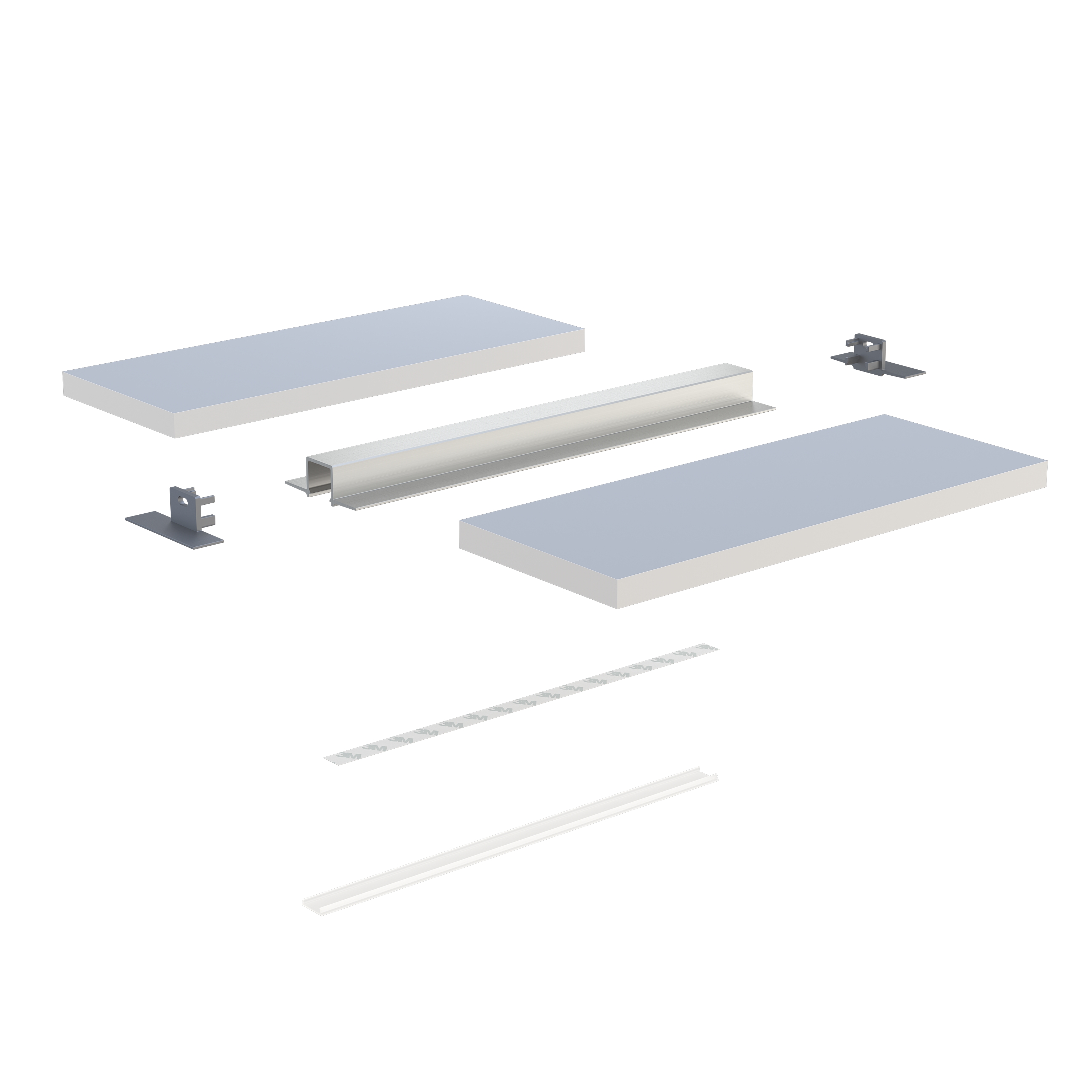 Explosionszeichnung zum Beleuchtungssystem bestehend aus folgenden Elementen: Profil GAUDI und (1) Abdeckungen BASIC, (2) LED-Streifen, (3) Endkappen