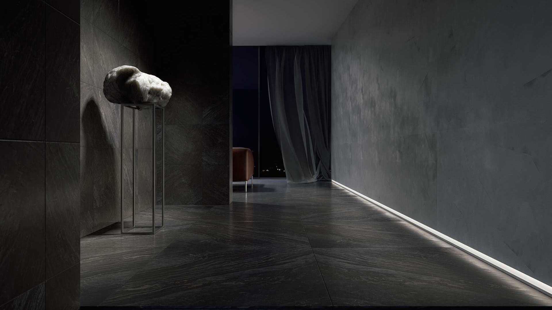 Anwendung: TIANO Sockelprofil mit BASIC-Abdeckung, optional mit Acryl-Frontabdeckung, in die Wandfläche eingelassen.